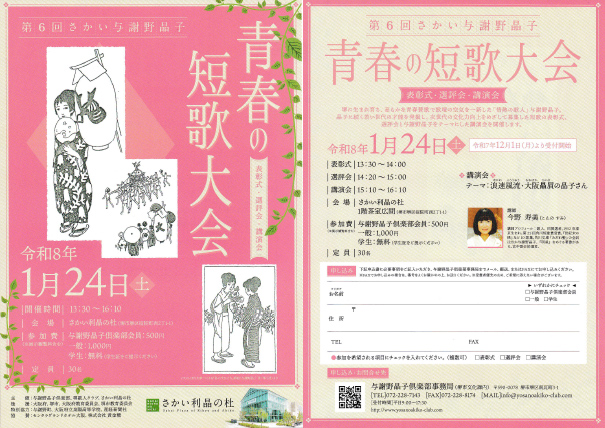 | 令和8年1月24日(土)に、さかい利晶の杜にて表彰式等を開催いたします。講演会では、今野寿美氏(歌人:本短歌大会選者)をお招きし、"浪速風流・大阪贔屓の晶子さん"をテーマにお話いただきます。 参加者を募集しますので、詳しくは、別添のチラシをご覧ください |
